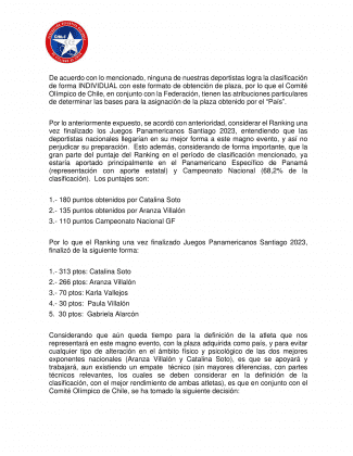 El comunicado detalla que los criterios establecidos de clasificación, por los cuales no se pudo alcanzar una solución satisfactoria y que derivó en una denuncia formal de parte de Aranza Villalón, quien acusa a la Federación y al Comité Olímpico de Chile (COCh) por quitarle un cupo que, a su juicio, se había ganado deportivamente.