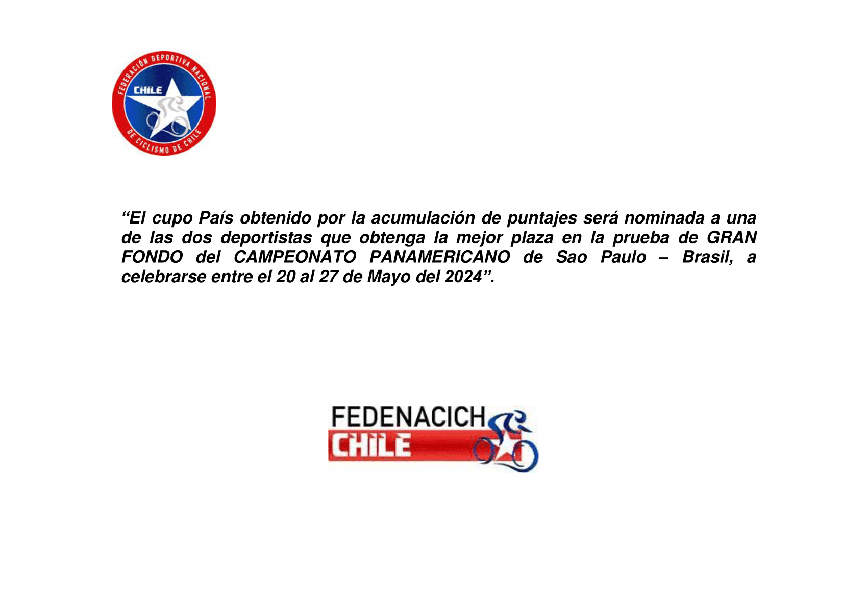 “El cupo País obtenido por la acumulación de puntajes será nominada a una de las dos deportistas que obtenga la mejor plaza en la prueba de GRAN FONDO del CAMPEONATO PANAMERICANO de Sao Paulo – Brasil, a celebrarse entre el 20 al 27 de mayo del 2024”, expone el documento.