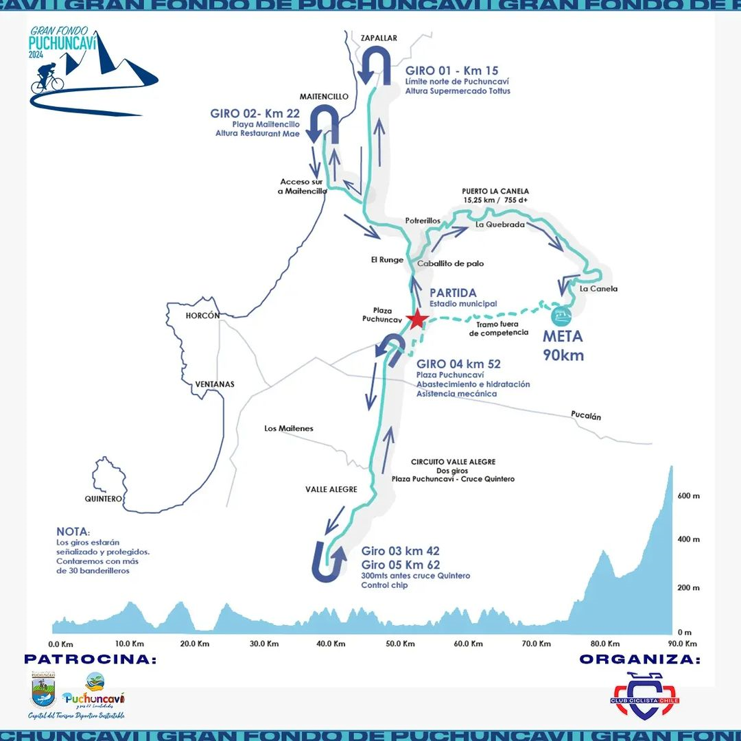 El Gran Fondo Puchuncaví es una carrera de distancia única de 90 kilómetros con una altimetría acumulada de 1.838 metros de desnivel positivo, en un circuito que une campo y mar.