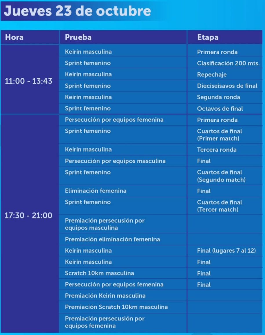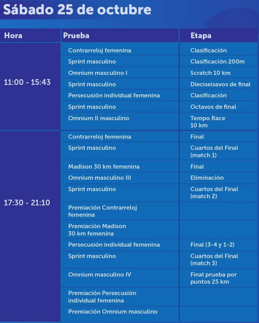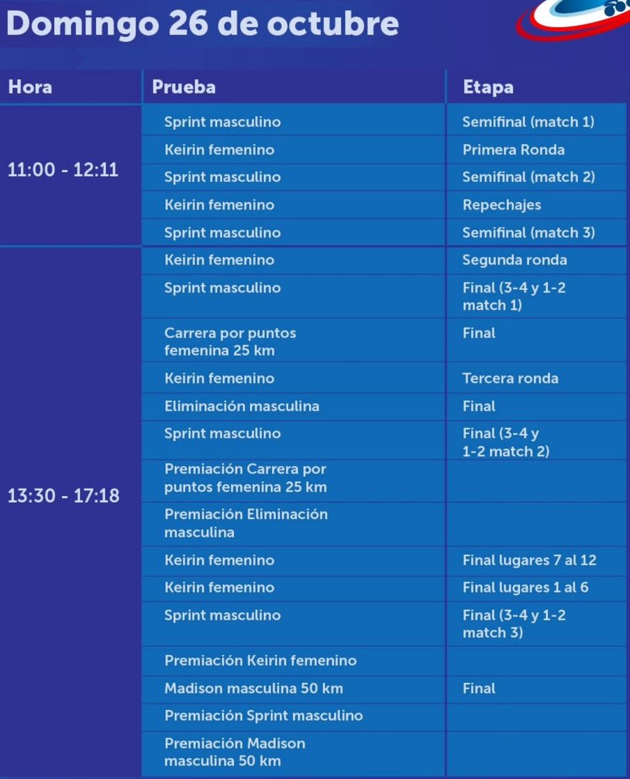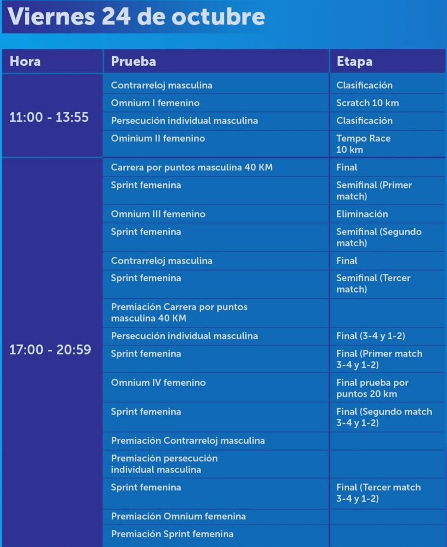 Las disciplinas de este evento son: Velocidad individual y por equipos, keirin, ómnium, madison, scratch, persecución individual y por equipos, eliminación, carrera por puntos y contrarreloj de 1K.