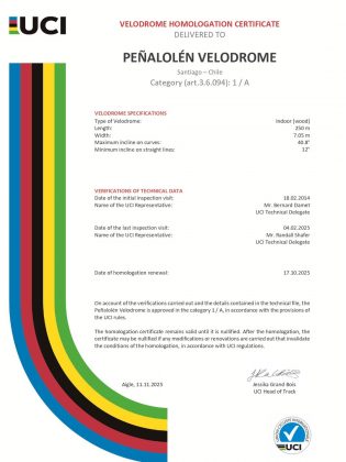 Desde la Federación de Ciclismo de Chile informaron la homologación oficial del Velódromo de Peñalolén, reconocimiento otorgado por la Unión Ciclista Internacional (UCI) elevando el recinto a la categoría 1/A.