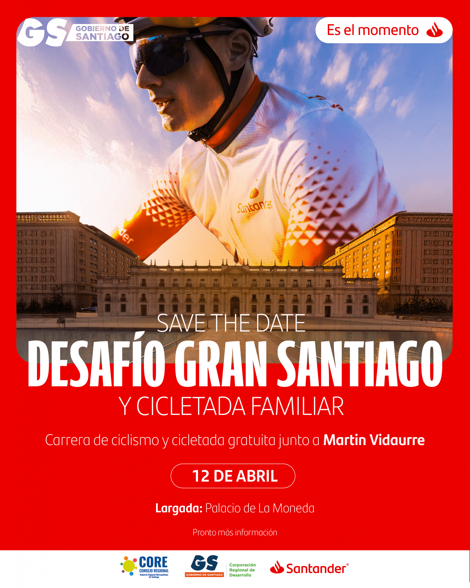 El domingo 12 de abril de 2026 se llevará a cabo la 1ª edición del Gran Desafío Santiago organizado conjuntamente con el Banco Santander y el Gobierno Metropolitano de Santiago y con la presencia del destacado ciclista nacional Martín Vidaurre. La actividad partirá en el Palacio de La Moneda.