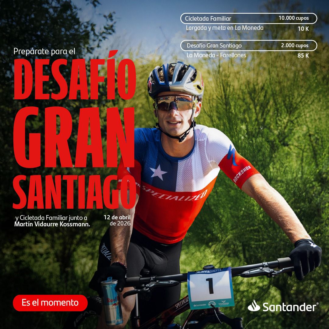 La primera edición Desafío Gran Santiago y Cicletada Familiar by Santander abrió sus inscripciones este jueves 26 de febrero, una experiencia de ciclismo donde se espera que 12 mil ciclistas se tomen las calles de Santiago el domingo 12 de abril de 2026 y donde también podrán compartir ruta con el gran ciclista nacional Martín Vidaurre.