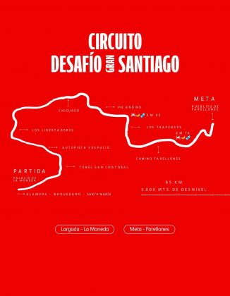 Con un circuito espectacular, el Gran Desafío de 85K comienza en La Moneda pasando por el Túnel San Cristóbal, Autopista Américo Vespucio, Los Libertadores, Chicureo, Pie Andino, La Dehesa y llegando hasta Farellones