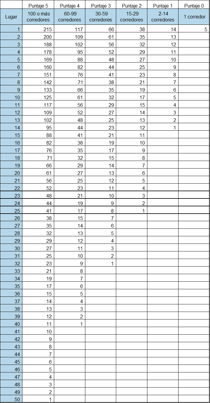 Los puntos se diferenciarán según el número de corredores en la categoría. Es decir, mientras más competidores más puntos obtendrán los primeros lugares. Los puntos se distribuirán de la siguiente manera: